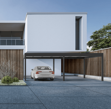 CARPORT ECO is a contemporary garage roof that protects your car from sun, rain, wind and snow. It allows for optimum use of space. The open structure of the carport is suitable for both domestic spaces and municipal or company car parks. The system is available as a single or double carport, in free-standing or wall-mounted options. The ability to expand the system and install additional elements (such as side walls, zip screens, or LED lighting) increases the functionality of the system. CARPORT ECO is an increasingly popular option for those seeking a lightweight, durable and easy-to-maintain structure as an alternative to traditional garages.